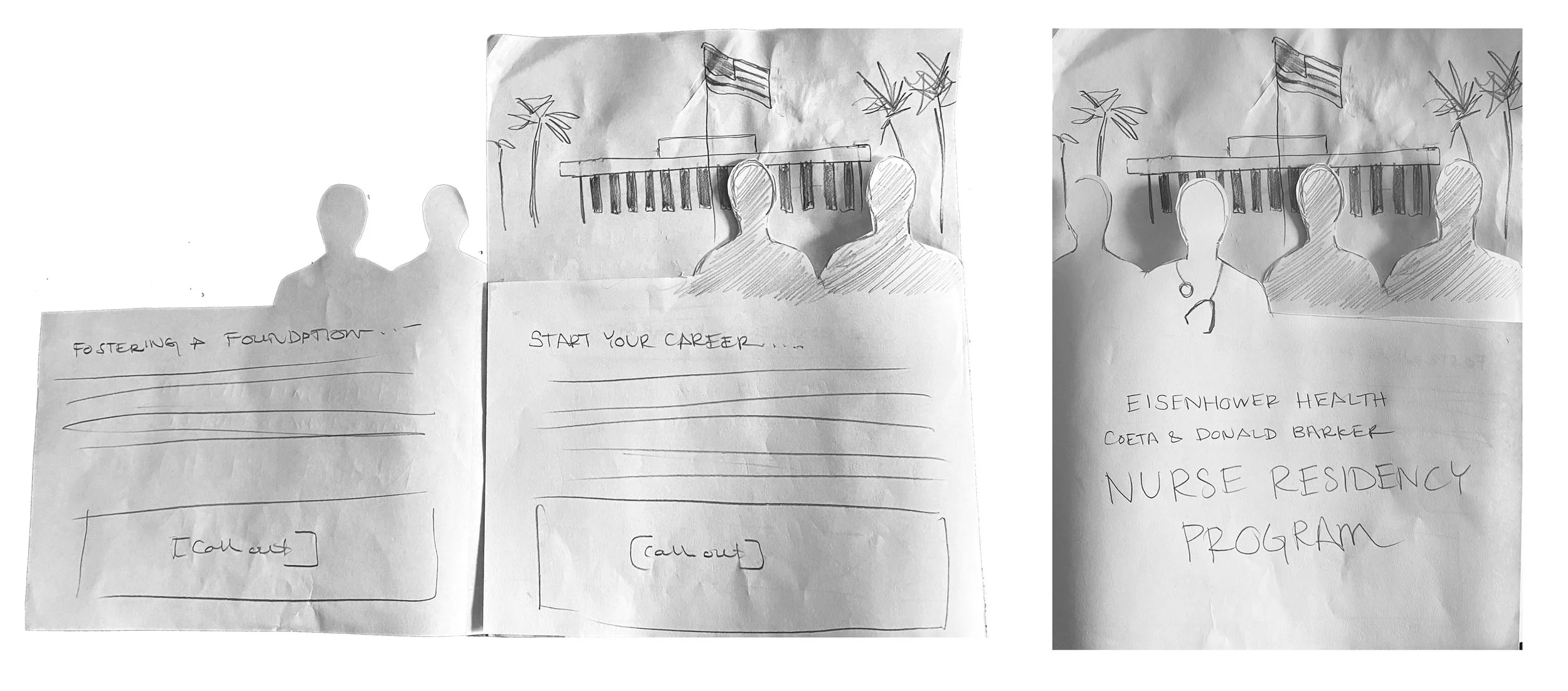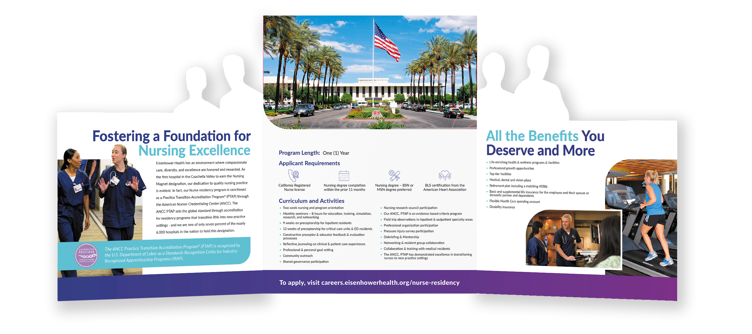 I designed a printed brochure for the Eisenhower Health Nurse Residency Program. This would used as a recruitment tool to distribute to the local colleges and Nursing students to let them know a bit more about our program. It would also be provided to interviewees as an informational takeaway. I created a unique design, complete with custom die cuts that touted Eisenhower Health’s Nurse Residency Program in a highly tactile piece that was intriguing and interesting to open and read.
